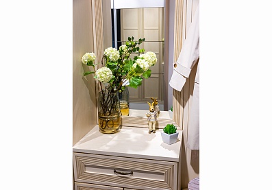 Внешнюю массивность шкафов облегчают открытые навесные полки и застекленные дверцы со внутренними зеркальными стенками. Благодаря этому меблировка не выглядит громоздкой, излишне тяжелой. Красивый природный рисунок подчеркнут патиной и лаком с шелковистой текстурой. Три напольных шкафа, настенные полочки, компактная тумба позволят разместить все самое необходимое.
