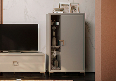 • Внутреннее наполнение: 4 стеклополки 6 мм за стеклянным фасадом, и 1 полка ЛДСП 16 мм — за глухим;