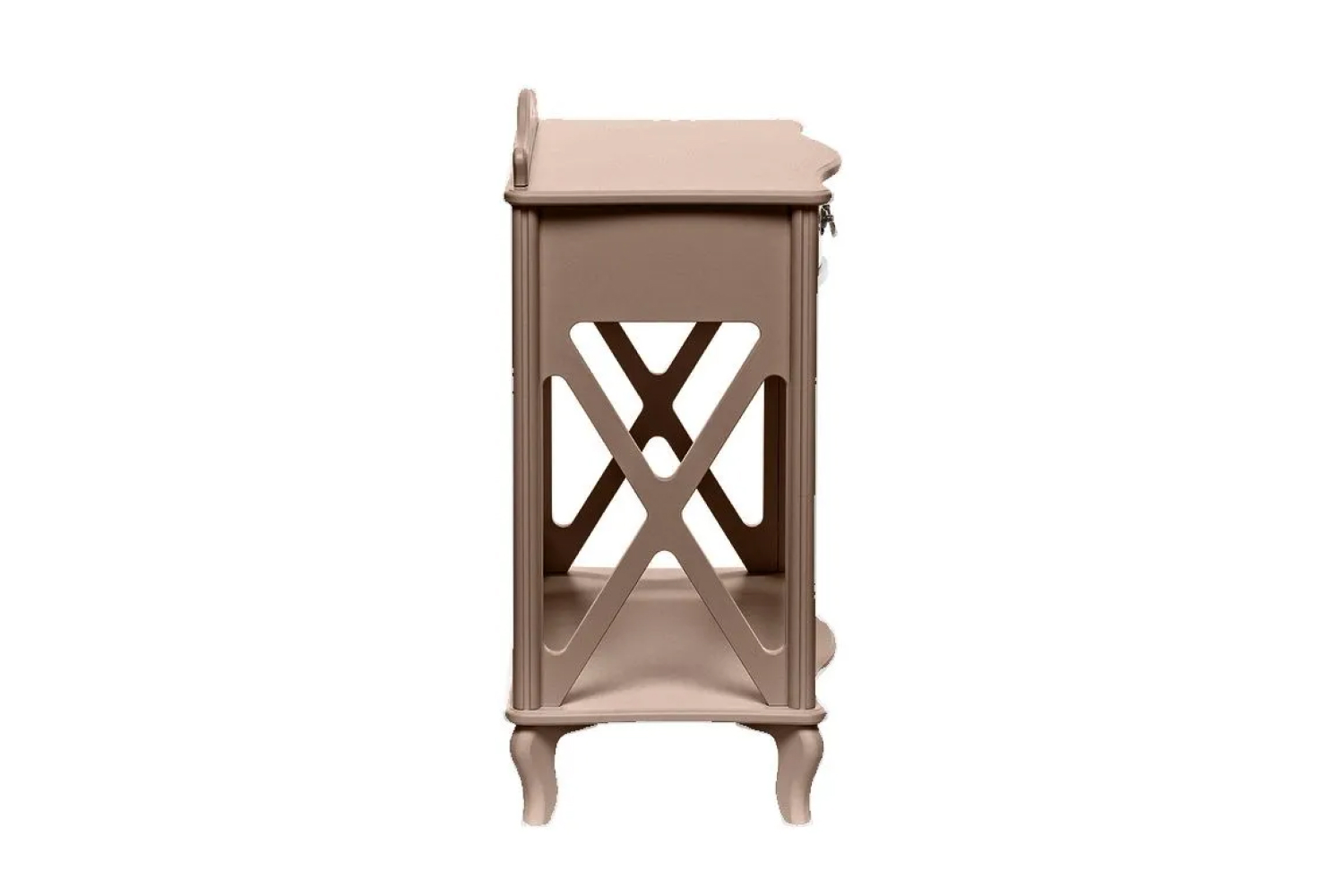 Узкий консольный столик «Джульетта» в цвете мокко предназначен для декоративных целей — на небольшую поверхность можно поместить вазу, сувенир, необычную статуэтку. Внешний вид изделия соответствует интерьерному стилю прованс. Бежевый оттенок, фигурная форма, изогнутые ножки, фурнитура в цвете «античная бронза» превосходно впишутся и в классическую обстановку. Основание модели выполнено из МДФ, боковины и столешница — из ЛМДФ, прочие детали изготовлены из шпона натурального ясеня. Изюминка консоли — боковые части в виде декоративных элементов фахверков. В компактном ящике с бесшумным механизмом выдвижения можно хранить любимые книги, косметику, украшения, очки, различные мелочи.